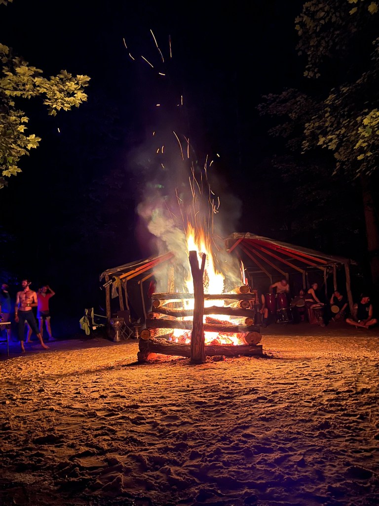 PawPaw! PawPaw is the name of the Drum Circle location at Wisteria, and it is a beautiful flat are part way down a ravine, where a bonfire is built every night surrounded by soft sand for dancing around, and a covered area from drummers, including community drums that any who want to play are welcome to. Dancing around a fire at night is one of the cliche pagan festival experiences, but not always one that I partake in. However, Paw Paw is so welcoming and feels so safe that I am willing to let go and drum and dance to my heart’s content there.